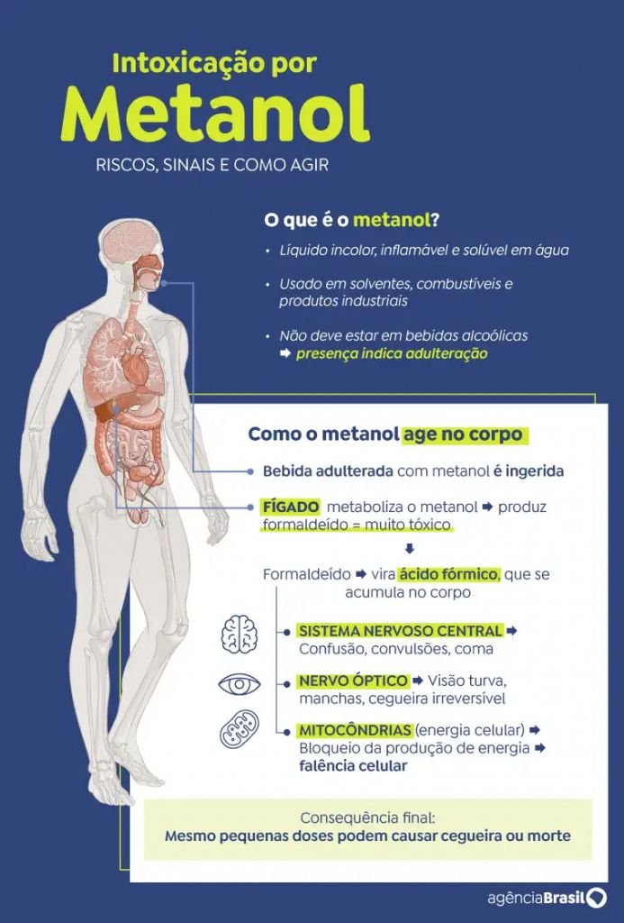 Aspecto biológico / fisiológico: Ao ser ingerido, o metanol é absorvido pelo trato gastrointestinal e levado ao fígado, onde enzimas metabólicas (como a álcool desidrogenase) o convertem primeiro em formaldeído, e depois em ácido fórmico. Ambos são metabólitos tóxicos. O ácido fórmico interfere no metabolismo celular, prejudica a cadeia respiratória mitocondrial (produção de energia), e pode causar acidose metabólica – condição em que há excesso de acidez no sangue, comprometendo órgãos vitais. Um dos alvos mais sensíveis é o nervo óptico. A lesão pode levar a visão turva, até cegueira irreversível. Outras manifestações incluem dores abdominais, náuseas, vômitos, confusão mental, diminuição do nível de consciência — e, em casos graves, coma e morte. O tempo para surgimento dos sintomas é variável, mas costuma ser entre 12 e 24 horas após a ingestão, momento em que a pessoa pode associar os sinais a uma ressaca ou mal-estar comum, atrasando diagnóstico.