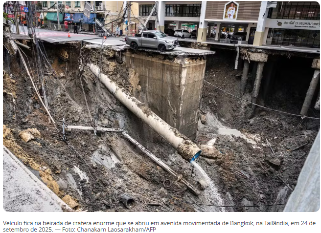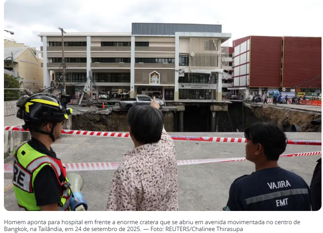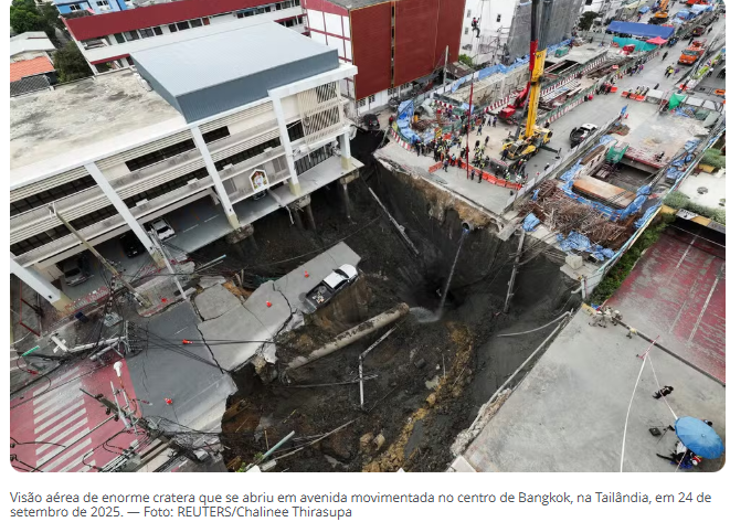 Na manhã do dia 24/09, a capital da Tailândia foi surpreendida por um fenômeno impressionante: um enorme afundamento de solo (sinkhole) em frente ao Hospital Vajira. A cratera atingiu cerca de 50 metros de profundidade e 900 m² de extensão, engolindo parte da rua, postes de energia e até um caminhão-reboque da polícia. O hospital precisou suspender o atendimento a novos pacientes, e casas próximas foram evacuadas.